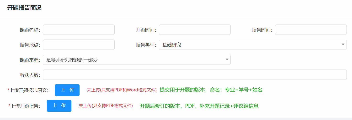 (一)开题2天前,学生在研究生系统中填报“开题报告”相关信息,“指导小组成员”填写本组开题评议教师,上传用于开题报告的版本(word版、PDF版)至“开题报告原文”处。
