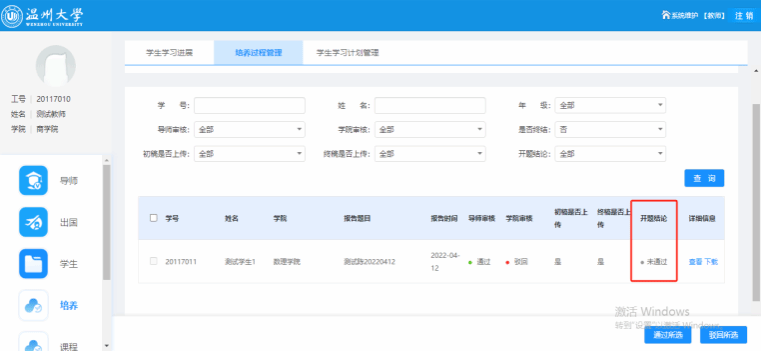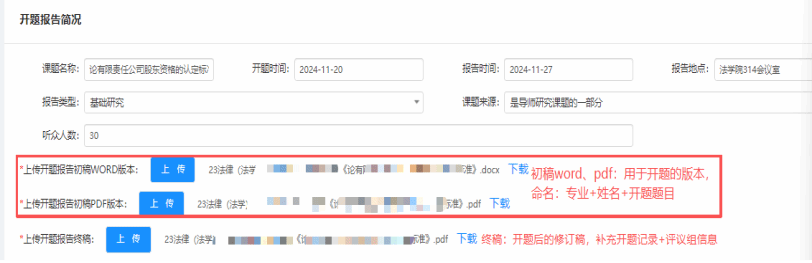(一)开题前2-3天,学生在研究生系统中填报“开题报告”相关信息,“指导小组成员”填写本组评议教师,上传用于开题报告的版本(word版、PDF版)至“开题报告初稿”处。
