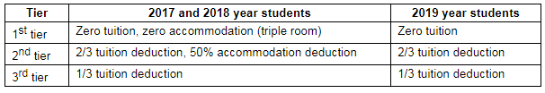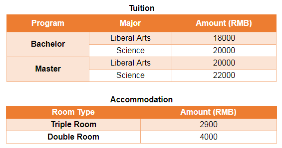 For Partial Scholarship, students majored in liberal arts will have a tuition deduction of 6000 yuan; student majored in science will have a tuition deduction of 7000 yuan.