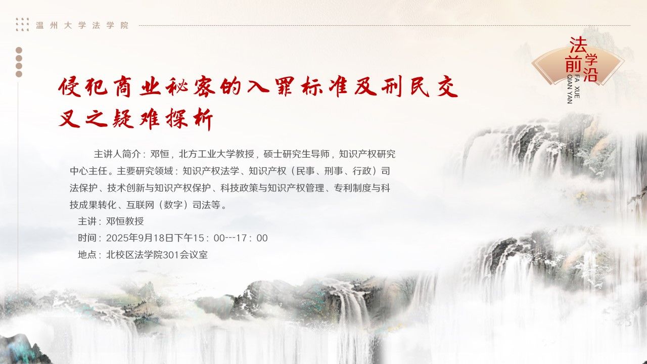 讲座预告|9月18日2025年法学前沿第1讲:侵犯商业秘密的入罪标准及刑民交叉之疑难探析