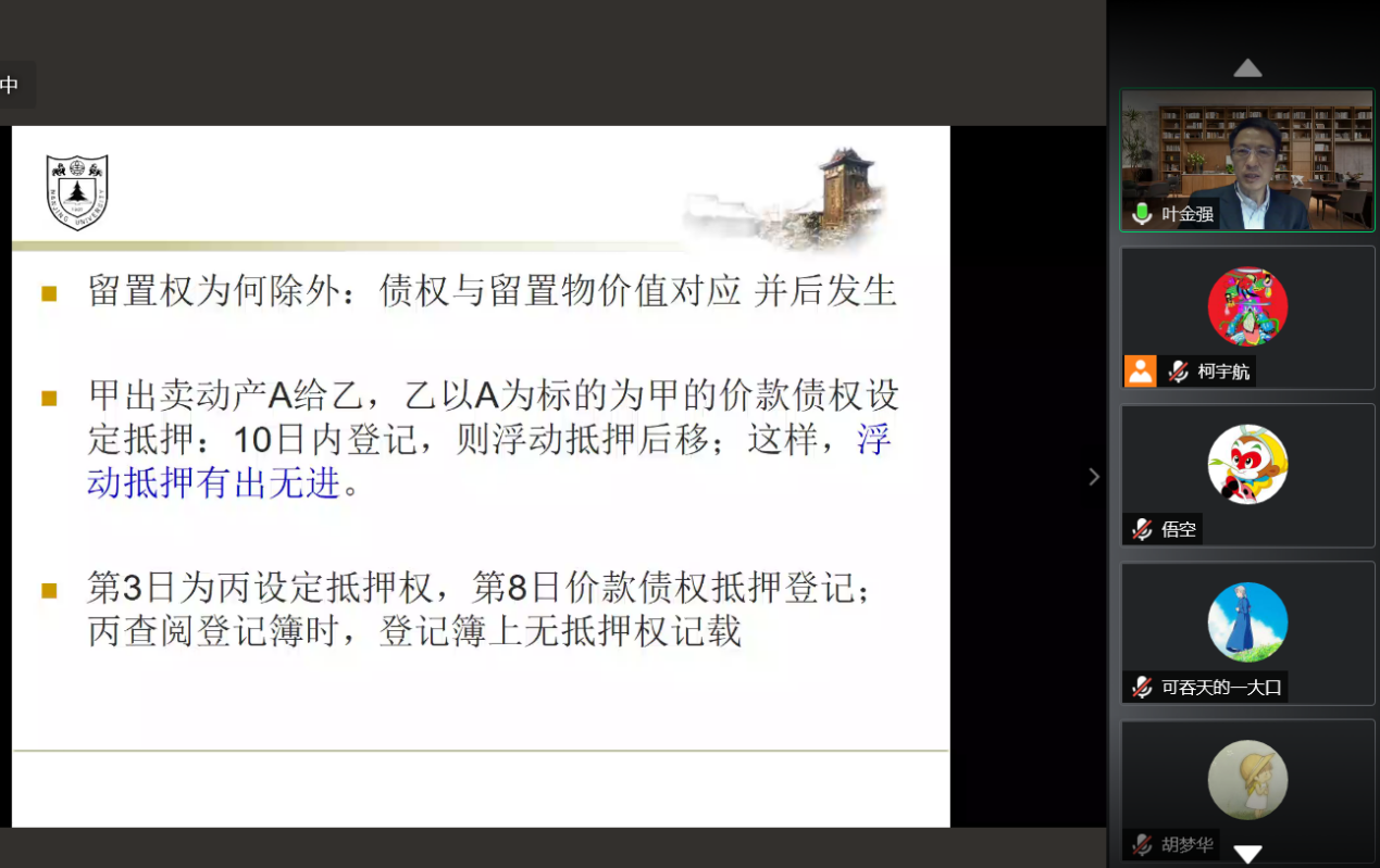 叶金强教授以《民法典》对担保法的规制为主线,辅以相关现行法和法理分析,为大家清晰地阐释了《民法典》中担保制度的守成与创新。内容包括三个部分:物的担保类型和效力的创新、保证制度的创新以及对三个具体非典型担保——保理、所有权保留及融资租赁的列举说明。叶教授重点讲述了两个方面的内容:一是以物权法定之缓和为进路,对非典型担保特别是让与担保进行了说明。一方面,根据《民法典》第388条的第1款,结合第10条的规定,并比较我国台湾地区民法的相关规定,叶教授认为,我国《民法典》已为物权法定原则的缓和及通过习惯创设担保物权提供了解释空间,同时根据《九民纪要》第66和71条为未来对《民法典》非典型担保的司法解释指引了方向;另一方面,在讲座的第三部分中先后对所有权保留、融资租赁以及保理合同的相关问题进行展开和具体说明,与第一部分内容融汇贯通、相互呼应,为担保制度的思考提出了新方向。二是通过对超级优先权的剖析,叶教授在对《民法典》中的担保各规定之间体系上的融洽提出肯认、对学术界中对于租赁权公示等存在争议的问题进行解释的同时,也指出了规定之中一些还较为模糊的地方,为学界之后的研究提出了新的要求。