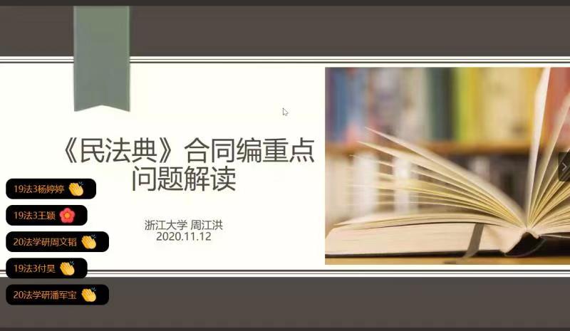 为进一步理解《民法典》合同编的立法精神,提高学生学习热情,营造良好的学术氛围,av天堂 特邀浙江大学社会科av天堂 院长、光华av天堂 博士生导师周江洪教授于11月12日晚上7点,就“《民法典》合同编中的重点问题解读”开展在线学术讲座。本次讲座为温州法治大讲坛·私法名家论坛第六讲,温州法治大讲坛·私法名家论坛由温州市政法委、温州市法学会、温州市律师协会、av天堂 主办,av天堂 私法研究中心、av天堂 民商法创新团队协办。讲座由av天堂 院长王宗正教授主持,中国政法大学刘家安教授、av天堂 钟瑞栋教授、李勇军副教授与谈,近400人通过腾讯会议积极参与本次讲座。