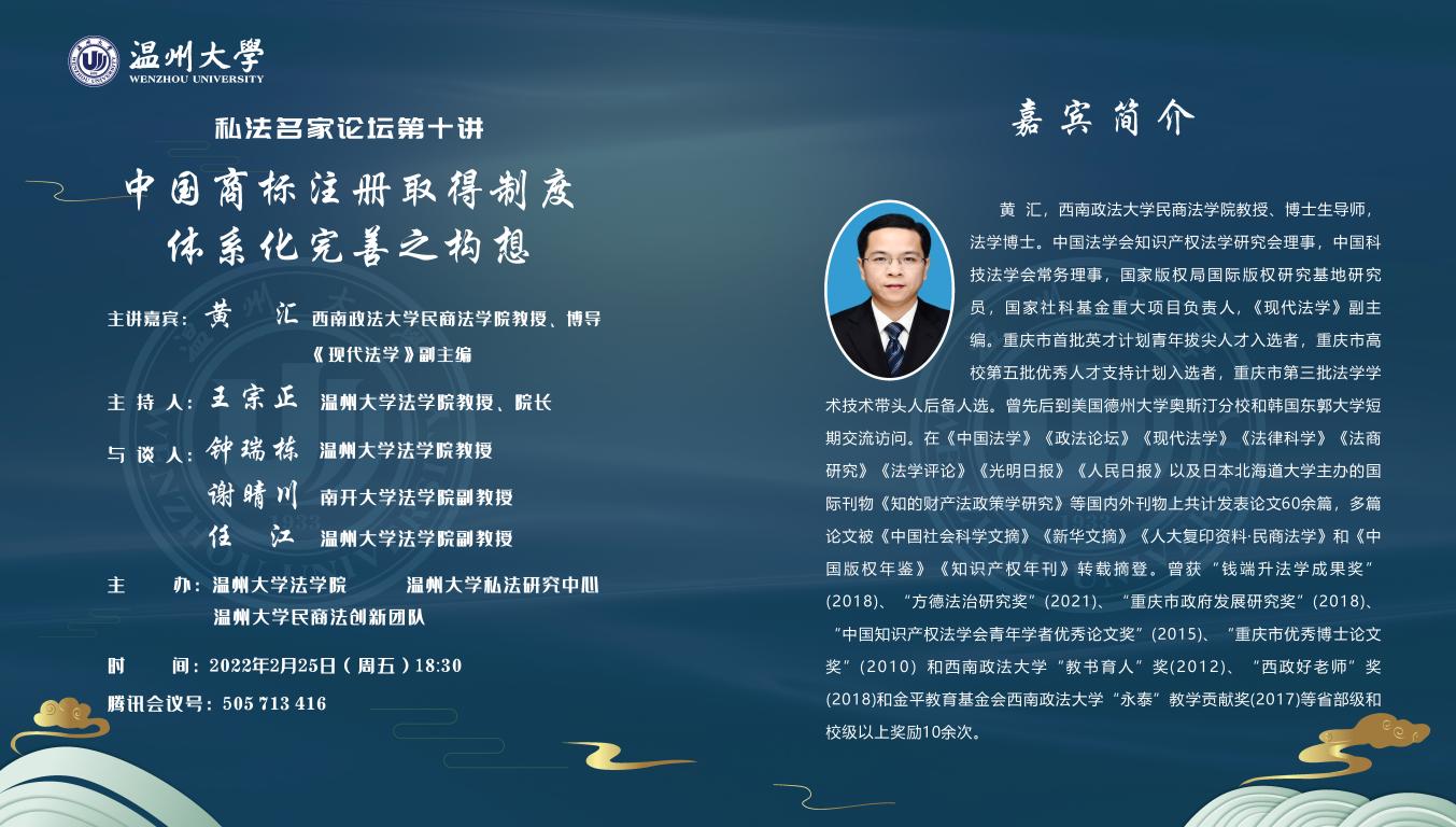 黄汇教授讲座题为“中国商标注册取得制度体系化完善之构想”, 本次讲座采取线上方式进行,由av天堂 院长王宗正教授主持,av天堂 钟瑞栋教授、南开大学谢晴川副教授以及av天堂 任江副教授与谈。av天堂 的老师、学生等260多人参加了本次讲座。