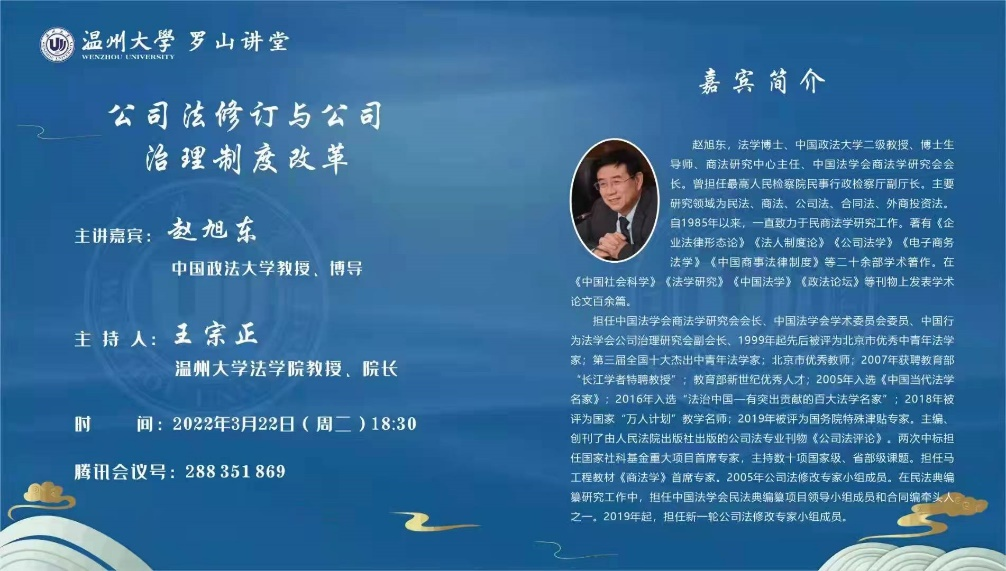 2022年3月22日晚,中国法学会商法学研究会会长、博士生导师、中国政法大学赵旭东教授作客av天堂 罗山讲堂,为我校师生作题为《公司法修订与公司治理制度改革》的讲座。av天堂 院长王宗正教授担任主持人,赵金龙教授、李勇军副教授担任与谈人。因疫情原因,讲座采取线上线下相结合的方式进行,300余人参加讲座交流。