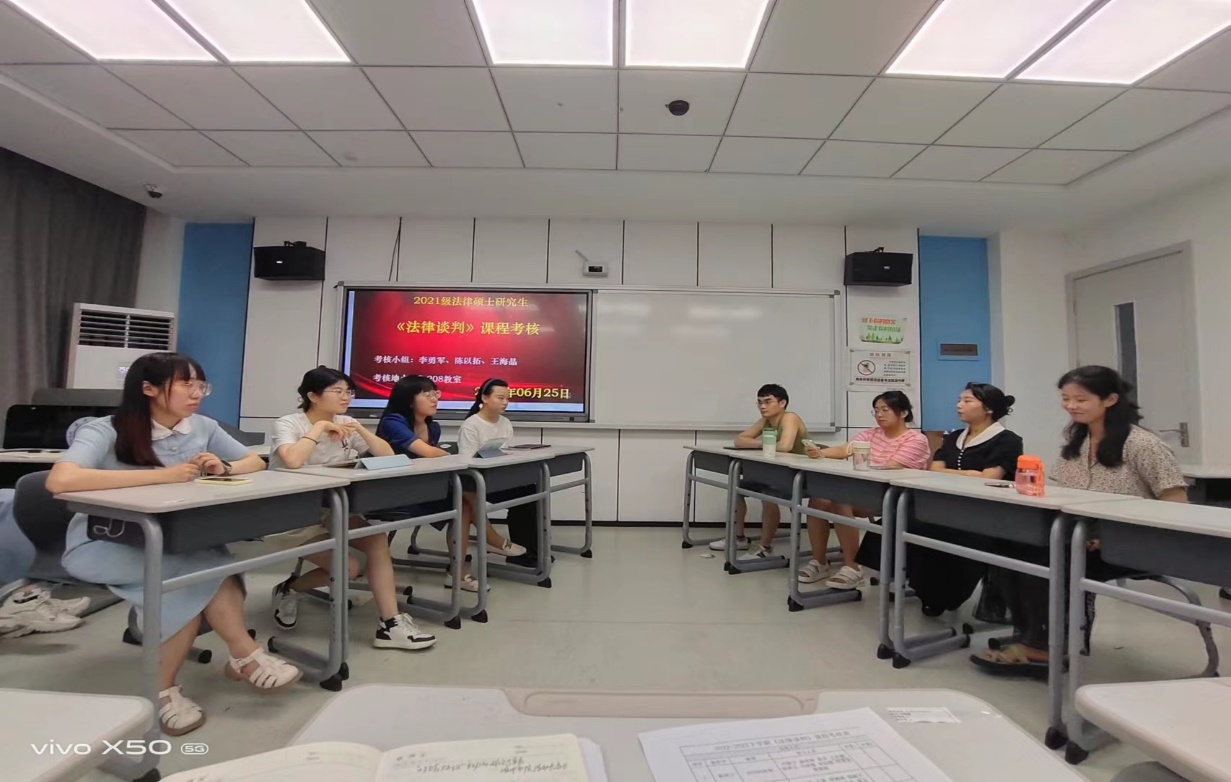 第三个环节,是课程考核环节。课程组成员李勇军副教授、陈以拓博士、王海晶博士组成《法律谈判》课程考核小组,在将研究生分为9个小组并分别选择不同案例的基础上,于6月30日,以小组为单位,通过对抗性模拟谈判方式进行期末考评。模拟谈判的现场,模拟各方都能围绕事实和法律及焦点,借助谈判原理和谈判技巧展开有效的沟通,达成相关谈判目标。