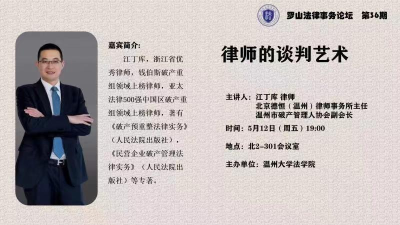 1. 5月12日,北京德恒(温州)律师事务所主任、温州市破产管理人协会副会长江丁库律师开讲,主题是《律师的谈判艺术》。