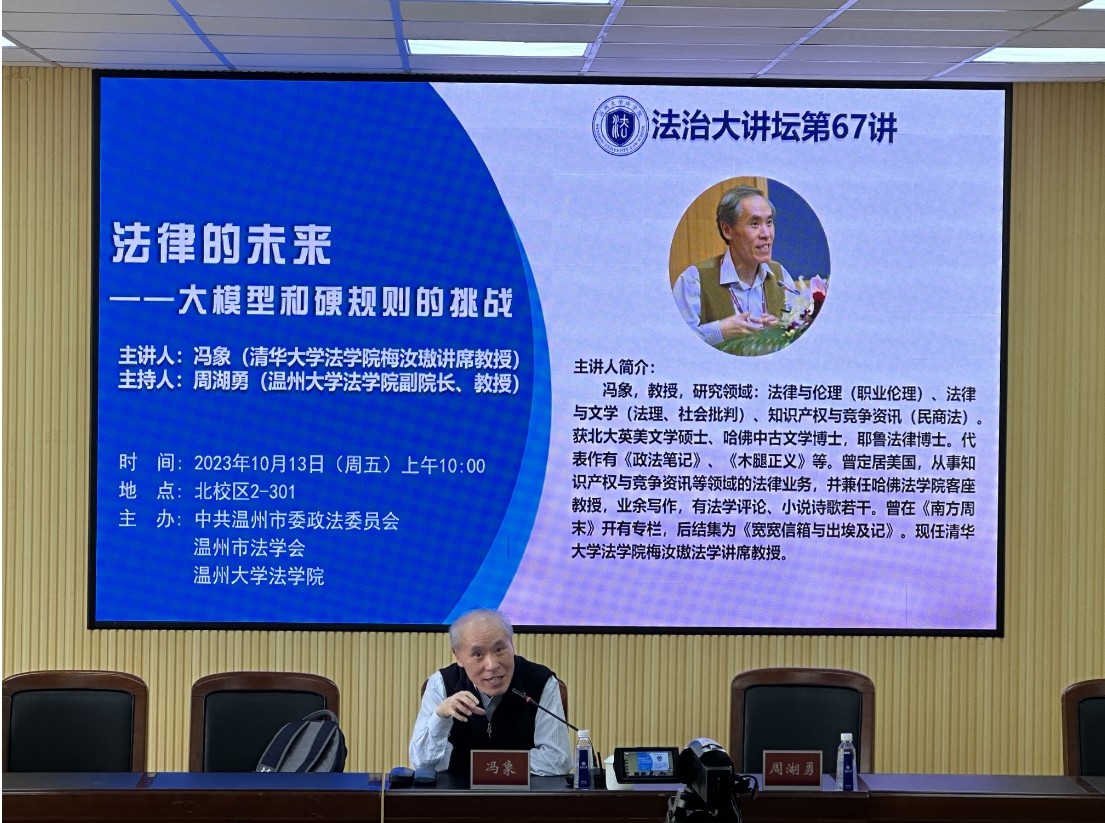 2023年10月13日上午,清华大学av天堂 梅汝璈讲席教授冯象老师应邀做客罗山讲堂·温州法治大讲坛第六十七讲。本次温州法治大讲坛由温州市政法委员会、温州市法学会、av天堂 主办。
