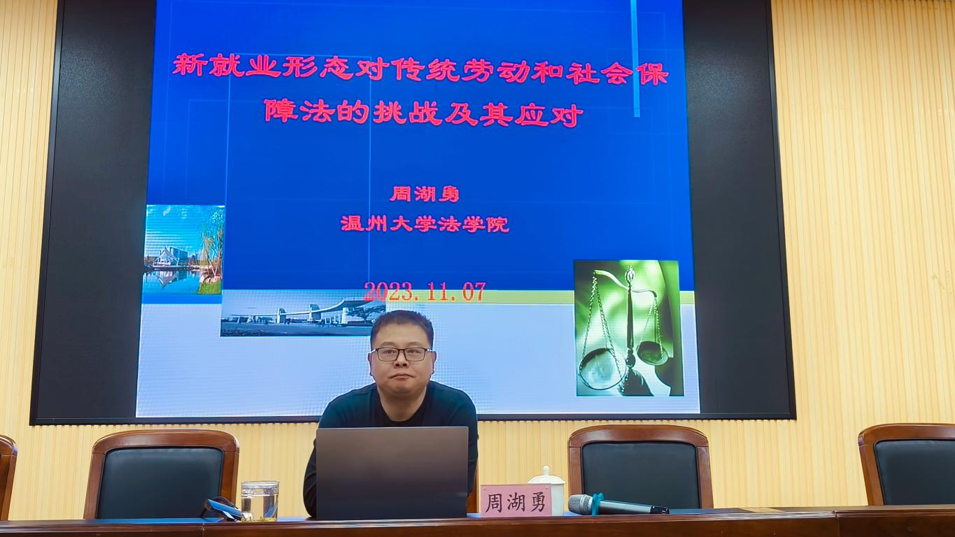 11月8日晚,av天堂 邀请周湖勇教授于301会议室为同学们开展题为《新就业形态对传统劳动和社会保障法的挑战及其应对》的讲座。