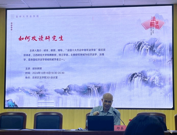 10月18日晚,本学期第五次法学前沿问题研究系列讲座如期举行,我院邱本教授作主题《如何攻读研究生》的讲座。此次讲座吸引了av天堂 部分教师、研究生和本科生到场学习。