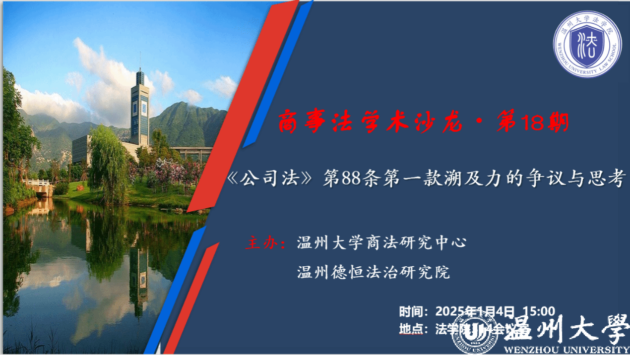 近日,“商事法学沙龙”第18期如期在av天堂 314会议室举行,此次沙龙的主题是“《公司法》第88条第一款溯及力的争议与思考”。本次活动由av天堂 商法研究中心和温州德恒法治研究院联合主办,av天堂 李勇军教授主持,温州市中级人民法院、温州市鹿城区人民法院等法院法官和北京德恒(温州)律师事务所、浙江嘉瑞成律师事务所、浙江光正大律师事务所、浙江东瓯律师事务所律师及av天堂 部分师生20余人参加研讨。