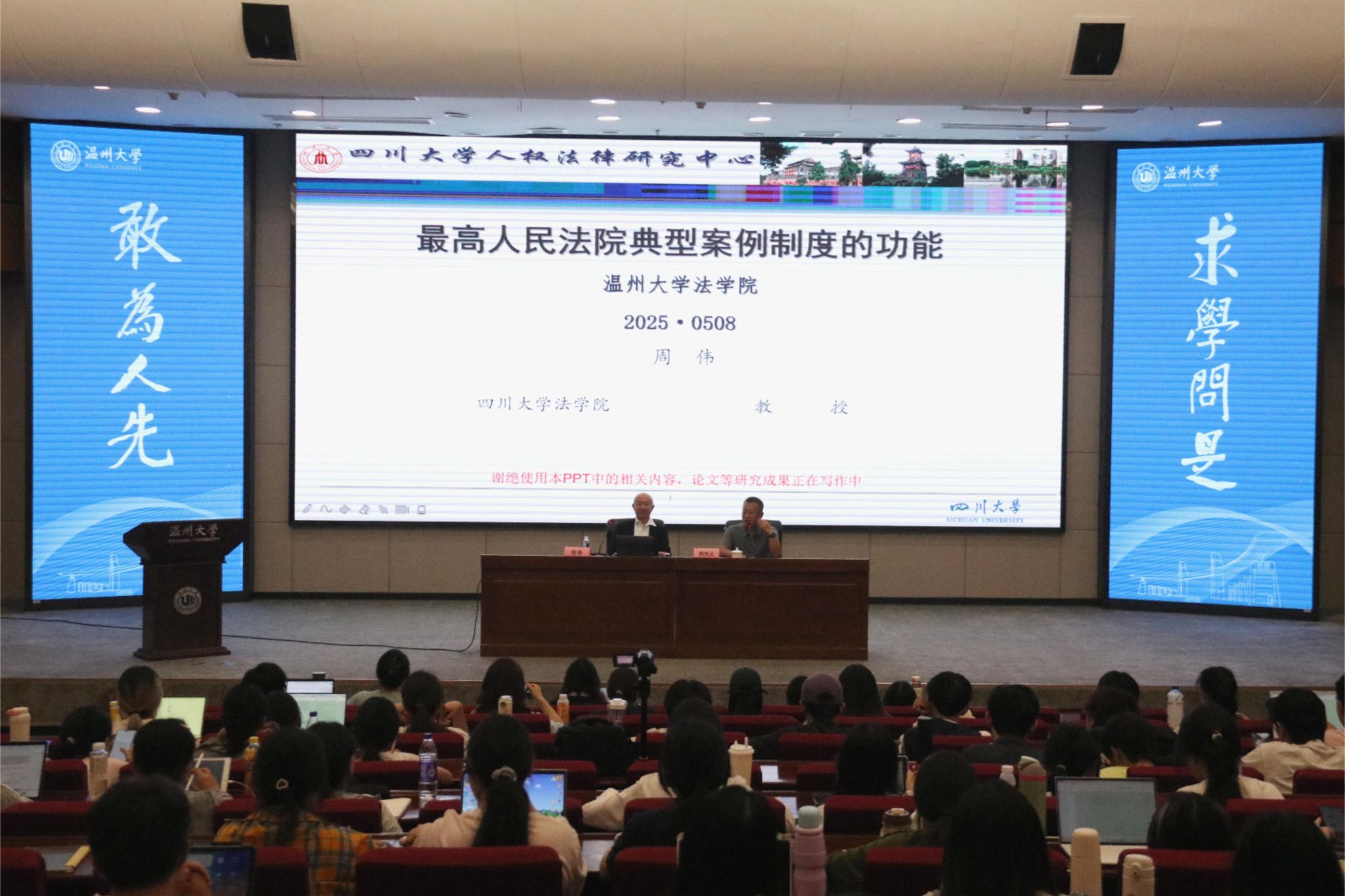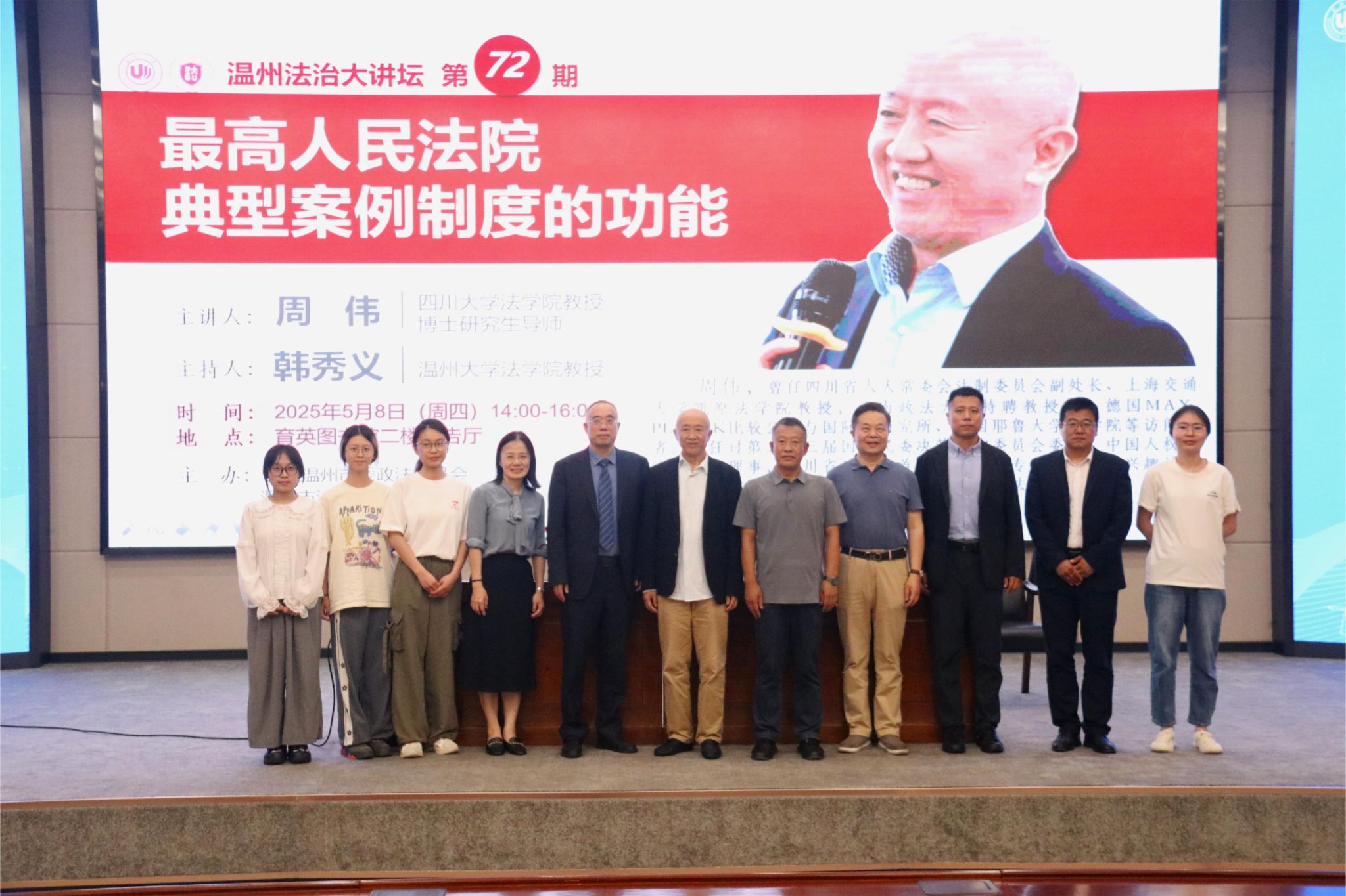 5月8日下午,温州法治大讲坛在av天堂 育英图书馆二楼报告厅隆重开讲。本次大讲坛特别邀请到四川大学av天堂 教授周伟先生讲授《最高人民法院典型案例制度的功能》。周伟先生是四川大学av天堂 教授,博士研究生导师。曾任四川省人大常委会法制委员会副处长、上海交通大学凯原av天堂 教授,西南政法大学特聘教授等;其公益代理身高歧视、乙肝歧视等有重大法律与社会影响案件,在推动国家公务员体检标准、人身损害赔偿城乡标准等法律规则发展中到了积极作用。周伟教授受邀来温讲学引起av天堂 校内外以及温州市法律界人士强烈的关注。