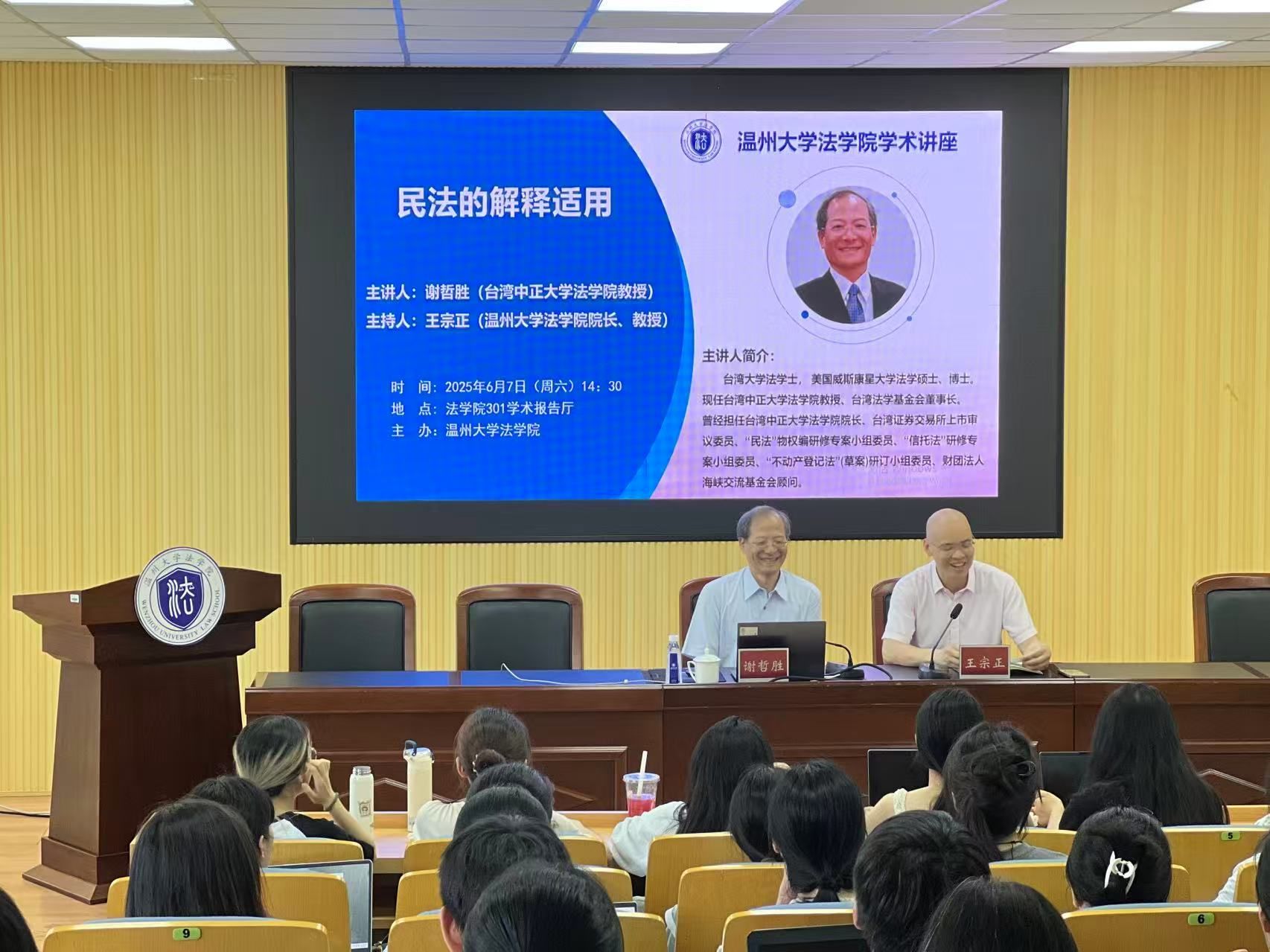 6月7日下午,由av天堂 主办的学术讲座《民法的解释适用》在av天堂 301学术报告厅热烈开讲。本次讲座特邀我国台湾中正大学av天堂 教授、台湾法学基金会董事长谢哲胜先生主讲,av天堂 院长王宗正教授主持并致欢迎词,吸引我院师生50余人积极参与。