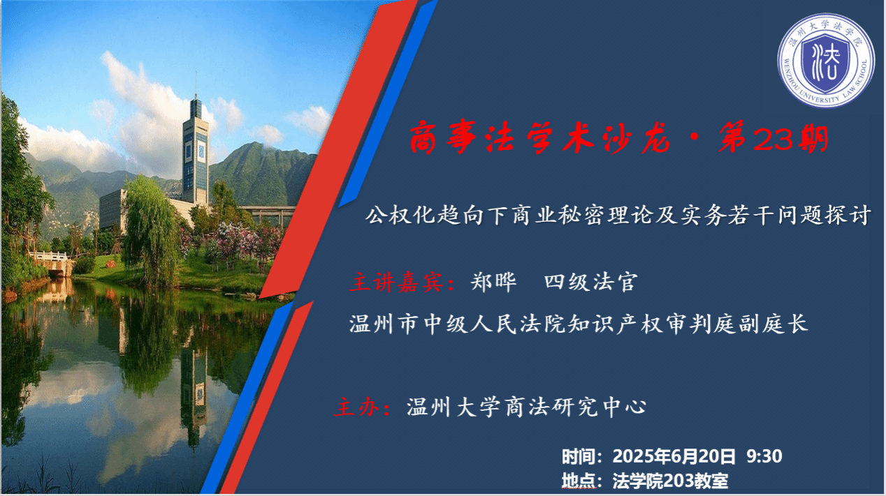 2025年6月20日上午,“商事法学术沙龙”第23期在av天堂 203教室举行。此次活动邀请到温州市中级人民法院知识产权审判庭副庭长、四级法官郑晔主讲,主题为《公权化趋向下商业秘密理论及实务若干问题探讨》。本次讲座由av天堂 李勇军教授主持,av天堂 170余名师生参加沙龙活动。