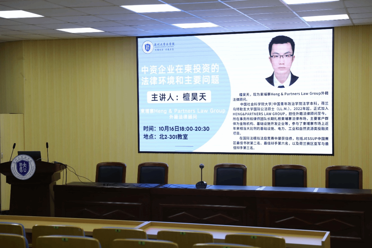 为深入推进涉外法治建设,助力av天堂 涉外法治人才培养,2025年10月16日,av天堂 特邀柬埔寨Heng & Partners Law Group檀昊天律师担任主讲嘉宾,围绕“中资企业在柬投资”的法律环境和主要问题,为av天堂 学子带来了一场内容详实的专题讲座。讲座由国际法系副主任白亚宁老师主持。