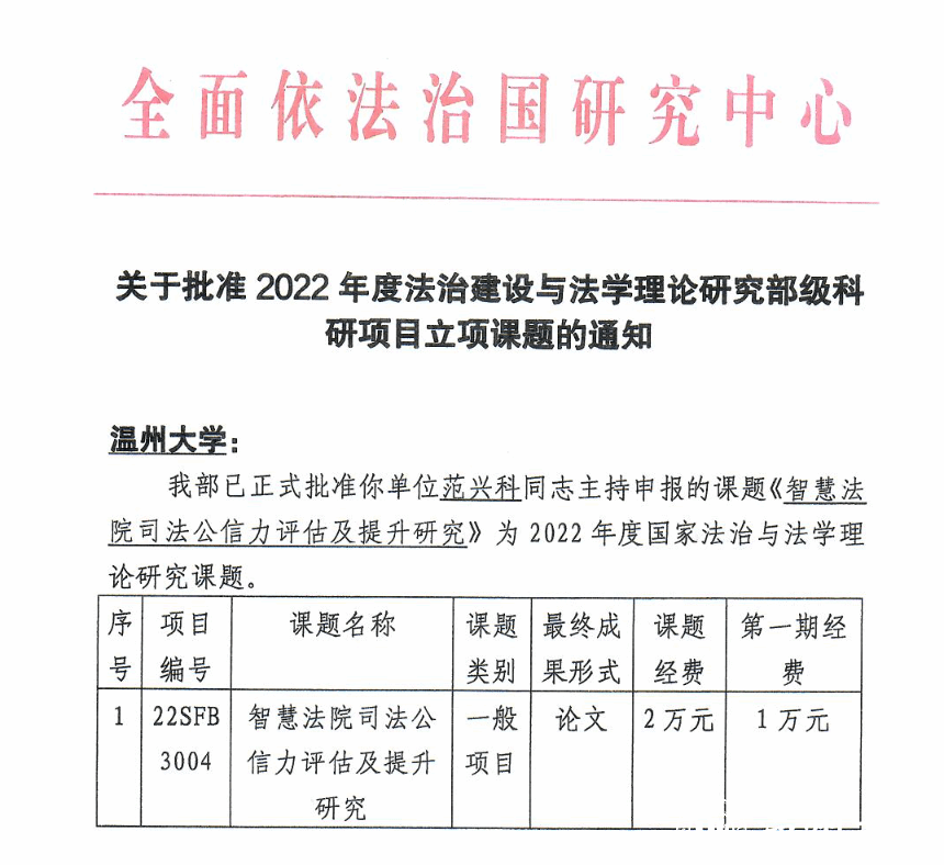 近日,司法部全面依法治国研究中心正式发布了司法部“法治建设与法学理论研究”部级科研项目立项课题的通知,我院范兴科老师主持的《智慧法院司法公信力评估及提升研究》获得立项。立项信息如下: