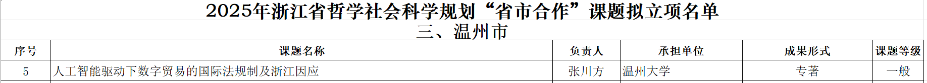 近日,浙江省哲学社会科学工作办公室公示了2025年度浙江省哲学社会科学规划“省市合作”课题拟立项名单,我院张川方博士主持的《人工智能驱动下数字贸易的国际法规制及浙江因应》获得立项。立项信息如下: