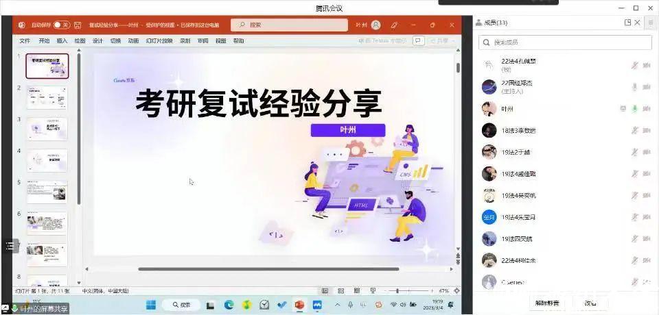 为帮助我院2023届考研学子从容应对即将到来的考研复试,av天堂 于3月4日晚举办了“同侪互助、‘研’途有你——av天堂 2023年考研复试朋辈分享会”。本次分享会邀请了谢高潋、崔雪晶、刘念、叶州、吴家欢、雷澳咪、张洪艳七位成功上岸的18级同学作考研复试备考经验分享。