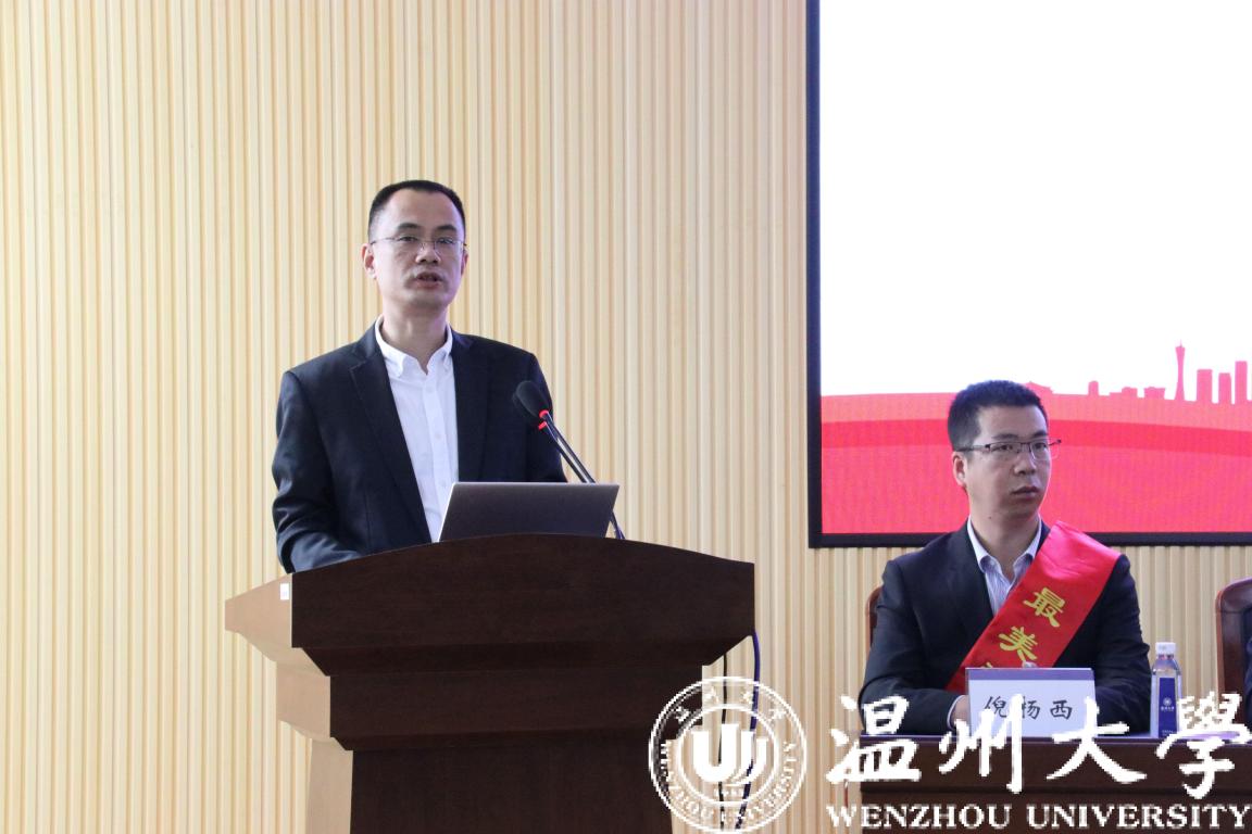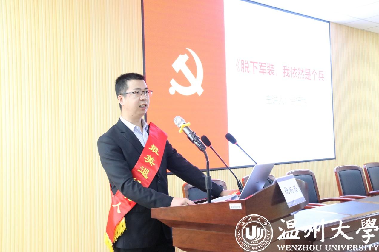 首先,温州市退役军人事务局党组成员、副局长朱翼作讲话。他指出,温州是一片具有光荣革命传统的热土,是一座具有双拥优良传统的光荣城市。他提到,温州最美退役军人充分展示我市广大退役军人积极作为、自强不息的精神风貌,在驻温部队官兵和广大退役军人中引起不忘初心、牢记使命,争当先进的的意识和行动自觉。他希望全体学生从先进典型身上汲取精神营养,明确发展方向,以更高的标准要求自己,他对青年大学生提出三点希望:第一,胸怀祖国,存爱国之情;第二,敢于担当,聚爱国之力;第三,锤炼品德,养爱国之心;第四,练真本领,撑爱国之行。
