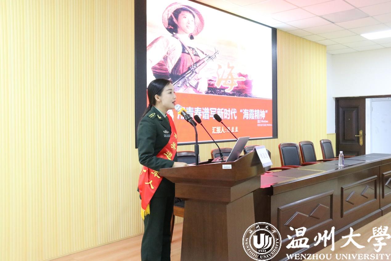 最美退役军人陈盈盈主讲了“用青春谱写新时代‘海霞精神’”。女子连民兵以连为家、艰苦创业、奋勇争先、锐意进取的先进事迹,向全社会传递了积极正能量。洞头先锋女子民兵连在陈盈盈的带领下,“爱岛尚武,励志奉献”,构成了百岛洞头一道英姿飒爽的风景。