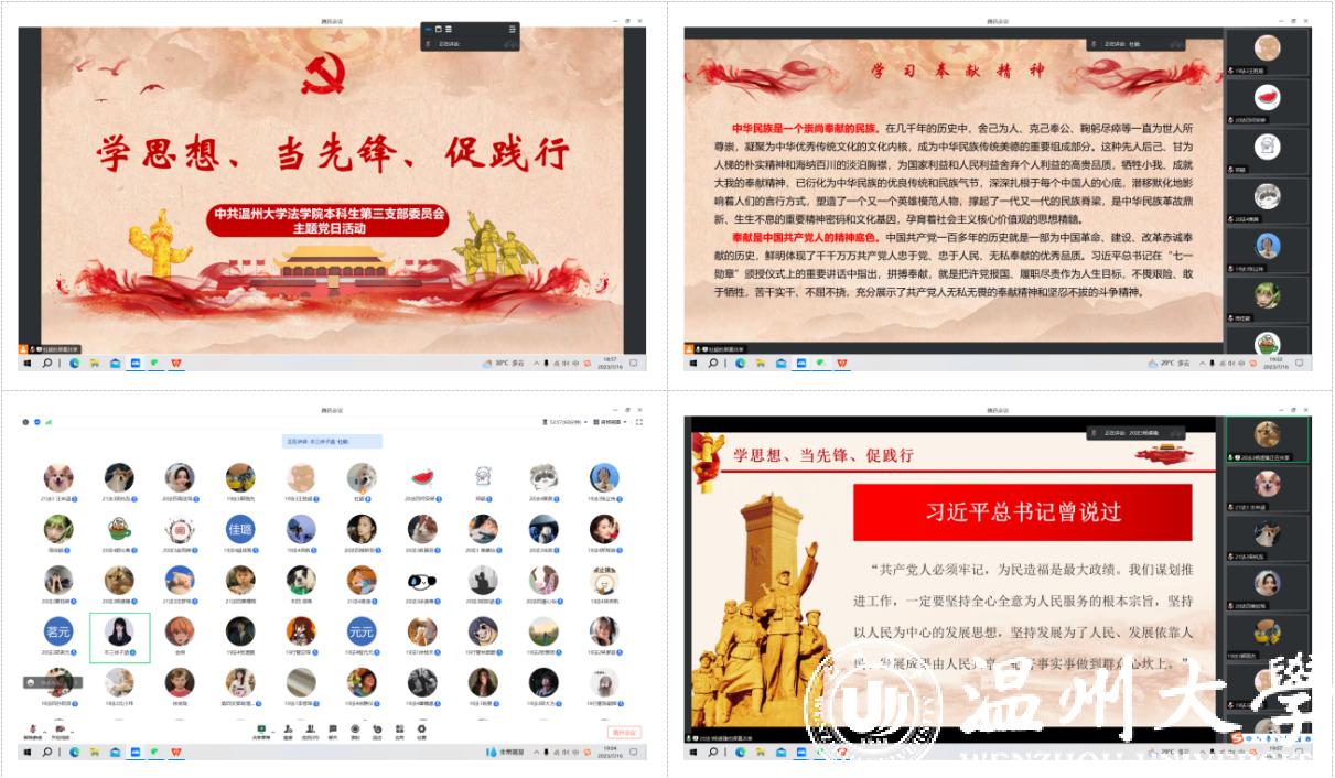 党的二十大报告指出,“统筹推动文明培育、文明实践、文明创建,推进城乡精神文明建设融合发展,在全社会弘扬劳动精神、奋斗精神、奉献精神、创造精神、勤俭节约精神,培育时代新风新貌”。为深入学习贯彻习近平新时代中国特色社会主义思想和党的二十大精神,进一步发挥基层党组织的战斗堡垒作用和共产党员的先锋模范作用,7月16日晚,中共av天堂 本科生第三支部委员会在线上开展了“学思想、当先锋、促践行”主题党日活动,本次活动由杜颖同志主持,参加本次活动的有党支部书记黄素素同志和全体学生党员。