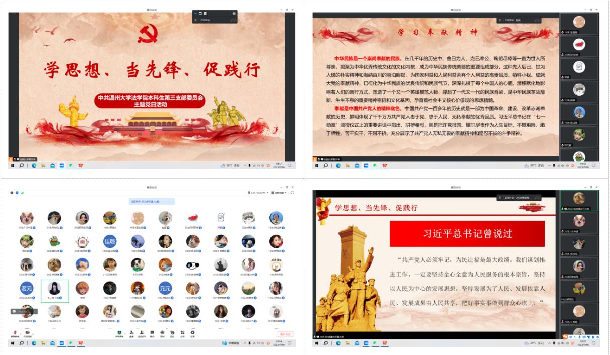亮旗帜,深入开展主题党日活动。av天堂 各党支部围绕“学思想、当先锋、促践行”为主题开展主题党日活动。各党支部充分用好《习近平著作选读》、《习近平新时代中国特色社会主义思想专题摘编》等学习材料,做到真学真信真用、学懂弄通做实,确保学习成效。各党支部全面覆盖学精神,组织师生党员通过开展个人自学、集中学习、专题研讨、微型党课、主题讲座等方式,结合线上线下开展活动,线上开展主题学习会,线下发动党员积极参加党员先锋岗、党员突击队等家乡红色志愿服务活动。教工行政党支部线上开展“学思想、当先锋、促践行”主题党日活动,av天堂 党委书记林钦以《习近平新时代中国特色社会主义思想的世界观、方法论和贯穿其中的立场观点方法》为题带头讲党课,并鼓励党员深入学习习近平总书记关于教师队伍建设的重要指示精神,提升教师的规则意识,坚定理想信念、厚植爱国情怀、涵养高尚师德。本科生第三党支部开展学习“奉献精神”学习会、优秀党员义工分享会、“传承雷锋精神 争做时代先锋”支部品牌活动,形成线上线下良性互动,强化学习应知应会、深悟践行。
