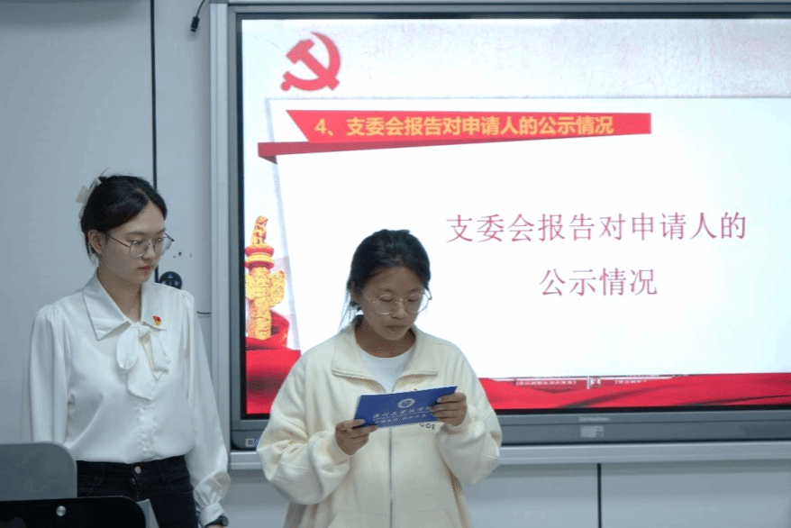 第四项议程:各学生党支部支委会向大会报告了在公示期间申请人的公示结果。