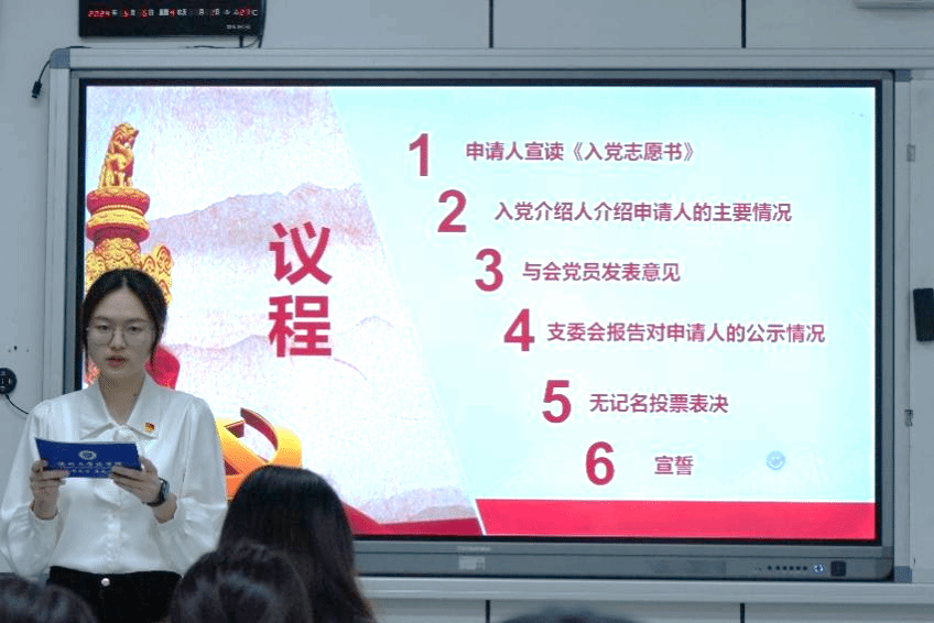 第二项议程:入党介绍人从思想素质、学习情况、日常生活等几个方面介绍了申请人的主要情况,同时指出其需要改进的问题,随后对其能否入党发表意见。