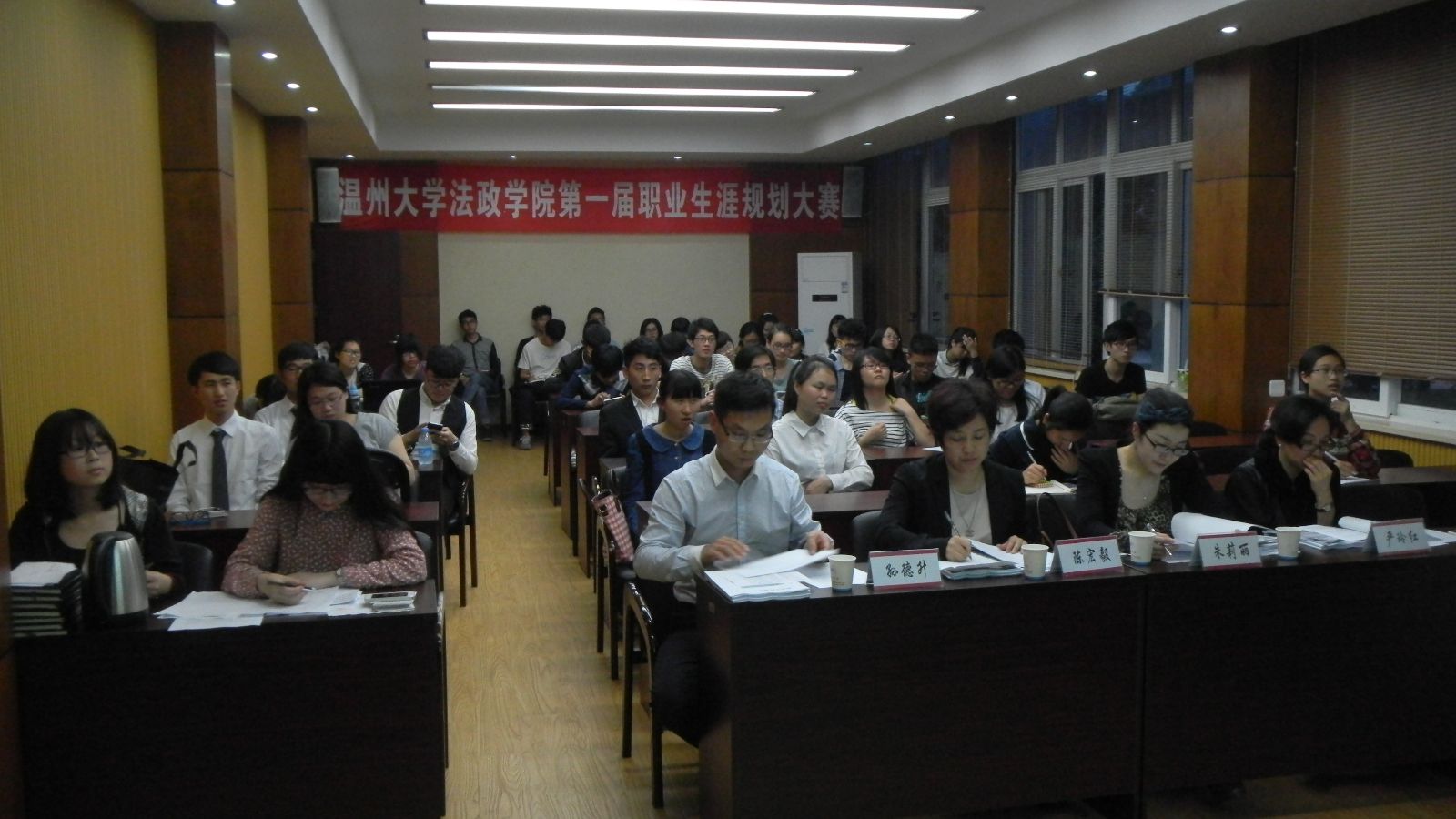 2015年4月28日18时30分,由法政av天堂 团委学生会就业部举办的法政av天堂 第一届大学生职业生涯规划大赛在法政楼一楼报告厅举行。出席本次比赛的评委有:av天堂 就业工作处副处长陈宏毅、av天堂 就业处职业生涯规划老师朱丽莉、av天堂 法政av天堂 党总支副书记严玲红、法政av天堂 学生科孙德升老师。本次比赛由法政av天堂 团委学生会就业部的干事詹茹琦主持。