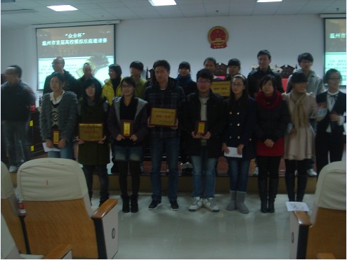 首先是书记员宣布法庭纪录;然后是审判长宣布开庭,公布原告被告,以及当事人的诉讼权利和义务;法庭调查;原告被告进行法庭辩论;法庭调解;审议庭评议;公布判决等程序。此案由于事实清楚,证据比较充分,经过了一个多小时较激烈的辩论,审议庭审议的时候现场观众对案件提出了自己的疑问并与参赛的选手进行了探讨,最后法庭作出了判决。瓯海法院副院长叶建平老师对本场比赛做了点评,他说选手们的表现都很到位,做到了层次清晰、秩序井然,展现了法律人的气度。