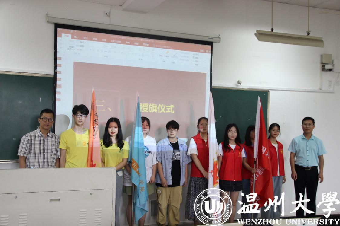 随后,由“星之火”实践队的薛娇同学带领同学们宣读暑期实践安全责任和文明礼仪承诺书。每一句承诺对于实践活动安全、顺利的开展都紧密相关,经过庄严承诺,参加实践的同学们更加坚定了信念,增强了纪律意识、安全意识、团队意识,在保障安全的前提下完成各项实践任务,还要注重文明礼仪,自觉维护学校形象和大学生的良好形象。随后,由4名队长代表全体队员签署暑期实践安全责任书,每位同学也都签署了相应的安全责任书。紧接着,由杨振海老师和孙德升老师向各实践队的队长授旗,手中接到的旗帜也是接av天堂 老师的嘱托与期望。我们相信,各位队长一定定带领队员们圆满完成各项实践任务,为社会做出更多贡献,让每一位同学在实践中收获历练与成长、收获深厚的友谊。