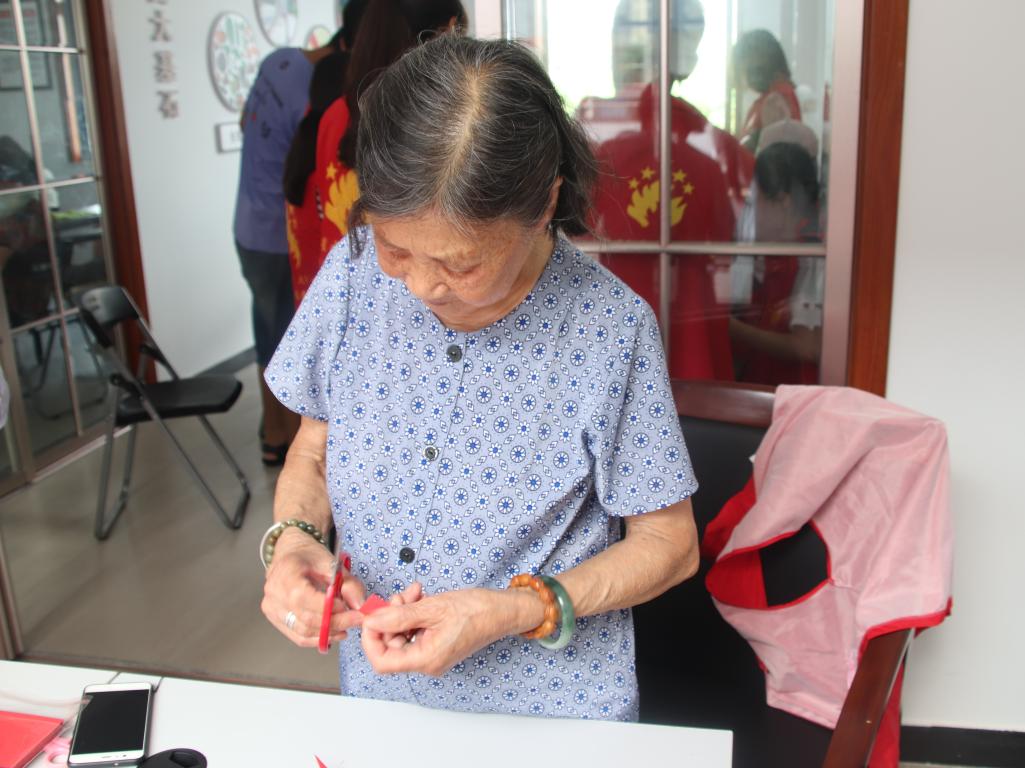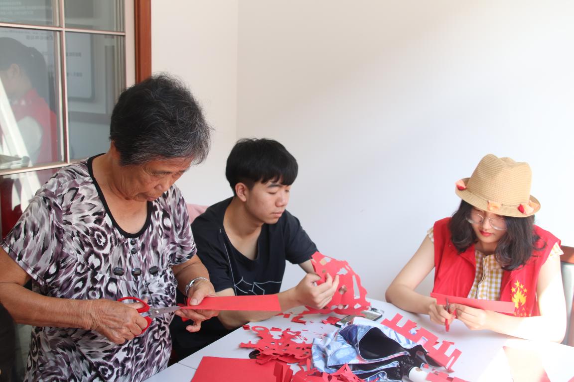 活动一开始,许多老人因为谦虚和害羞而站在一旁看成员画画、剪纸,随着活动逐渐进入高潮,老人们也开始跃跃欲试。他们拿出各自的绝活,或灵巧地裁剪出栩栩如生的花朵小动物,或大笔一挥几行清秀的毛笔字,一枝料峭春寒的腊梅便跃然纸上,令在场的每一个人惊叹不已。老人们也有带着小孙子小孙女来的,孩子们对这些活动有着极高的热情,爷爷奶奶看着可爱的孩子有模有样地专心致志地画画,满满的慈爱溢出来,真诚而亲切。爷孙俩共坐一张板凳,共握一支画笔,共同创作一把独一无二的扇子,这样的场景于老人们,于每位成员,于孩子们都将是难以忘怀的时光。