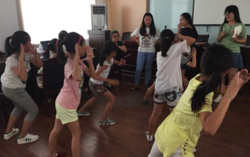 在短暂的户外活动后,我们回到教室,开展今天的主要内容------户内游戏。在每一个游戏前,老师都会讲解游戏规则,然后成5-6个人一组开始游戏。首先我们玩了抢凳子游戏。有5个人绕着4把椅子走动,音乐暂停,开始抢凳子坐下,输的人淘汰,依次减少椅子,直到只剩2个人抢一把椅子,最后抢到椅子的人胜出。孩子们在游戏中都很积极,最后每组的胜出者还进行了一场决赛,选出了冠军。接着我们还进行了其他一些考验反应能力的游戏,例如看卡片颜色抢答,萝卜蹲,天黑了请闭眼等游戏。孩子们都很积极的参与,在游戏中获得快乐。当然,将气氛推向了高潮的是海盗船长与007的游戏。大家围成一圈,由一个人开始随意指着一个人说"海"或"0",被指到的人接说一个字并随意指向他人,但被指到是"长"或"7"的人与他的左右两个人要做出相应的动作。做错的人会被惩罚,到中间给大家表演一段,唱歌跳舞背词讲笑话都可以。在这个过程中,大家获得了真正的放松,随意地玩耍,开怀地大笑,无形中大家的关系更近了一步。