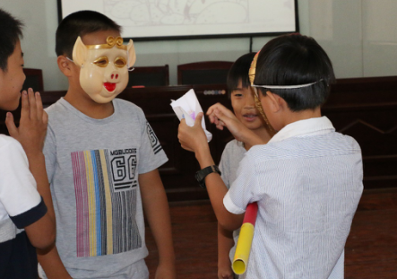 开始正式上课前,先用一个小游戏活跃课堂气氛,游戏是这样的:坐在第一排的六位小朋友上来抽取要念给后面同学听的小纸条,只有二十秒的时间来记忆,接着就念内容给后面的同学听,直到传到最后一位同学那里。最后把最后一排所有的同学请上来,请他们念出他们所听到的内容。可能是因为纸条的内容是绕口令比较难,所以最后的同学几乎是没有答对的,但他们彼此间多了沟通,多了合作,开场游戏也就发挥了作用。