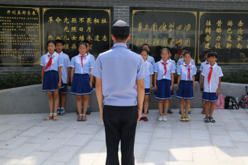 下午活动时小朋友们顶着烈日,早早地就赶来学校,整齐有序地排好队伍。这也令我们动容,我想这就是一种生活的态度。随后,实践队成员带着小朋友们体验了一次‘六个一’:一次与警营的密切接触、听一场红色故事、体验一次军队生活、重温一次少先队员入队誓词、观看一场红色电影、畅谈一次心得体会。在这之中,给我留下最深刻印象的是小朋友们站军姿的时候,他们站在阳光下,站在革命烈士纪念碑前,昂首挺胸,这是一种肃然起敬,一种对待自己精神世界的态度。