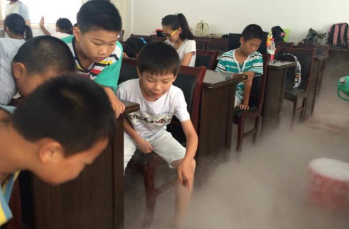 下午一点,孩子们准时到达教室,在惯例的点名以后,课堂正式开始。老师先给同学们放了动画电影大圣归来的片段,吸引同学们的兴趣,然后引入主题,带领他们一步步揭开"腾云驾雾"的奥秘。在老师的要求下,同学们都十分配合的闭上了眼睛,期间其他人员稳而有序地拎着装有干冰的水桶到达教室各个位置,同时倒入热水,刹那间白雾升起,老师适时播放西游记的片头音乐,孩子们睁开眼睛后惊喜地发现教室此时竟然已经变成了