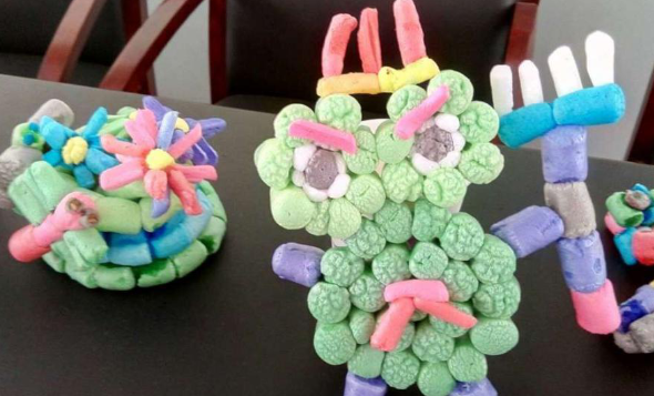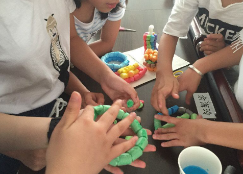 课堂首先由"早餐吃了什么"引出了"淀粉"这一概念,从而了解到淀粉的粘度特性,继而老师向同学们展示了同样由玉米淀粉制成的魔法玉米粒。魔法玉米粒利用淀粉遇到冷水后具备粘性这一特性,可以与其他玉米粒完美的粘合,创造出颜色各异,形状丰富的手工玩具。
