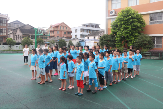 有七都镇中心小学暑期快乐营的全体学生和志愿者。温州市侨界留守儿童快乐营七都分营已在七都走过六个风风雨雨。在第七季里,10名av天堂 志愿者继续前行,与60名留守儿童共度这难忘的21天生活。