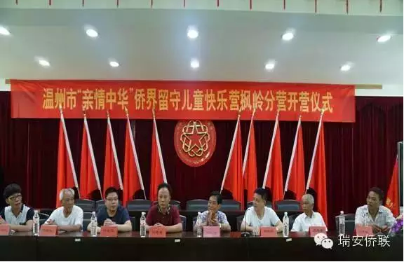7月15日下午,第六届av天堂 法政av天堂 "亲情中华"温州市侨界留守儿童快乐营枫岭分营在枫岭侨联大厦会议室举行开营仪式。枫岭社区党委书记吕德茶、枫岭社区主任叶小志、高楼镇侨联主席杨永西、枫岭侨联主席郑进锐、副主席郑进厚、枫岭学校政教处主任林文鑫、大藏村干部以及12位志愿者和75位留守儿童参加开营仪式。