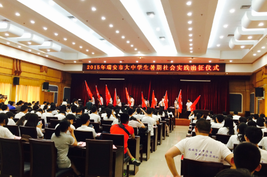 7月15号,瑞安"文明出行"调研分队的工作已经进入第四天。这一天,队员们在进行前一天的分发调查问卷的同时,还参加了瑞安市政府主办的瑞安市暑期社会实践队出征仪式。参加出征仪式的还有在瑞其他大学生暑期社会实践队员、回乡大中学生、实践对接单位负责人以及各镇街、市直高中团组织负责人等。瑞安市委宣传部、市教育局、市文明办等相关单位负责人也出席了仪式。