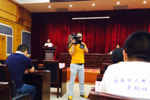下午两点半,实践队来到瑞安市政府多功能厅,参加2015年瑞安市大中学生暑期社会实践出征仪式。出征仪式由瑞安共青团团委书记曾国仕主持。他对今年暑期实践做了全面部署,提出广大队员要践行社会主义核心价值观的要求。仪式上,主席台领导向十支大学生实践队伍授旗。同时,为确保实践安全,实践队队员签订了安全保障责任书。大学生代表,文明出行实践队队长孙利丹上台做表态发言,并作出了郑重承诺。最后,瑞安市委宣传部副部长林式其对同学们提出了殷切希望。他希望同学们在社会实践中要立志,坚定信念;要立德,明德修身;要立学,珍惜学习机会;要立行,多与社会接触。