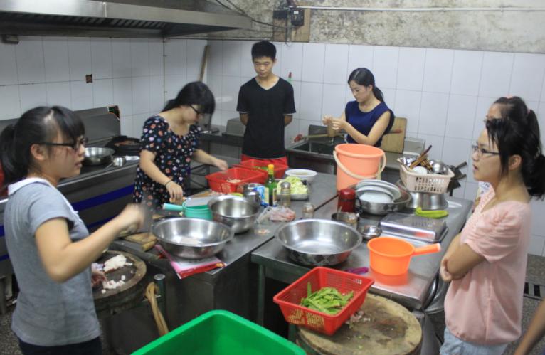 不再需要像平时那样早起,大家都睡到自然醒。不习惯没有湖岭孩子们的吵闹的第一天,队员们亦然决定自己动手解决三餐,创造我们的快乐生活。按照分工部分队友去市场购买了青菜、猪肉、海鲜等材料。手艺精湛的徐老师是我们的主厨,四川汉子何亦恒和伪汉子徐杨莎也顺利成章的成为助厨。洗,切,煮,八菜一汤是队员们辛苦一个早上的见证,是湖岭一条心的见证。晚上的蛋炒饭,简单却幸福。