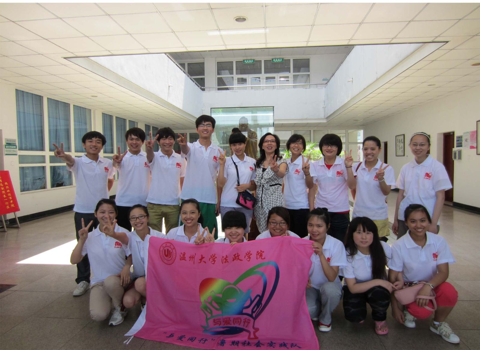 接着是具有纪念意义的授旗仪式,严书记将团队的队旗授予实践队,这意味着"与爱同行"暑期实践队正式出征开展志愿服务活动。最后本团队全体成员怀着关爱社会,服务社会之志,带着即将出征的兴奋之情,在法政av天堂 门口留念合影。