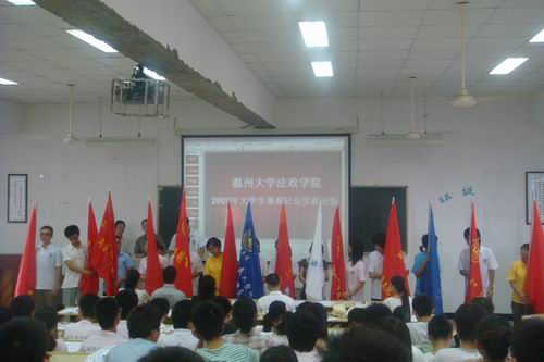 6月29日下午, av天堂 法政av天堂 2009年度大学生暑期社会实践动员大会暨出征仪式在2-203隆重举行。副院长姚周辉、钭晓东、院党总支副书记严玲红、学生科科长杨振海、辅导员孙德升、孙慧、林丽丽、各暑期社会实践队的指导老师以及18支暑期社会实践队的全体同学出席了此次出征仪式。学生科科长杨振海主持了本次大会。