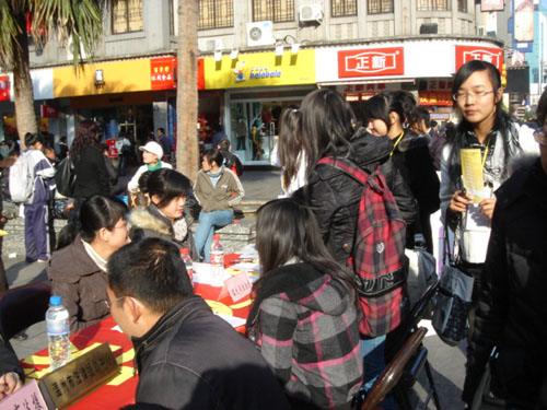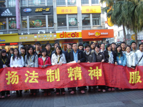 12月4日是普法宣传日,为了让市民更加地了解和支持中国的法制事业,av天堂 法律援助中心的成员们在12月6日12点集合并直奔目的地.最后决定将本次活动的地点放在五马街的小广场上.本次活动分成三部分:一.邀请温州市法律援助中心的专家以及温大法政av天堂 的大三学生叶雅青和谢思思给予免费的法律咨询.二.设了一条上面印有"弘扬法律精神,服务科学发展"的横幅,并鼓励市民们在上面签名.三.制作法治留言板,让人们写下自己对法治社会的看法.整个下午,来签名的人络绎不绝.满满一横幅的名字足以证明法治精神的深入人心.