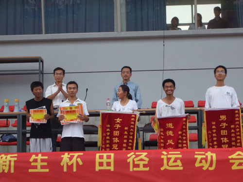 如此一场力量和速度的盛会,真可谓是精彩纷呈,高潮迭起。在田赛项目上,运动员们凭借精湛的技术和无比的自信,勇敢地挑战力量和技巧的极限,不断地创造佳绩。短跑项目上,运动员们如脱缰的野马奋力冲刺,长跑项目更是毅力和勇气的比拼……赛场上,健儿们挥汗如雨;看台上,同学们也鼓足了力气为运动员们呐喊助威。下午四点半,整场比赛尘埃落定,最终07法三获得了男子团体第一,07法二获得女子团体第一,而07法一则获得了体育道德风尚奖,金南松书记、辅导员孙德升、陈颖等老师出席闭幕式并为他们逐一颁奖。