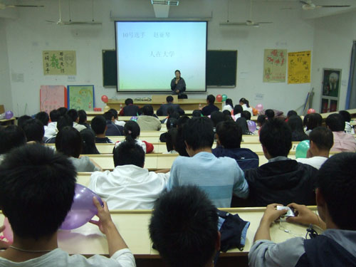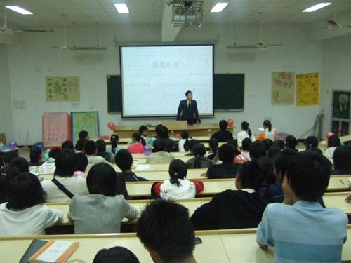 该赛事共分为三个环节。在第一个环节中,全体参赛选手紧紧围绕"学习十七大精神,构建和谐校园"的主题,分别作了精彩生动的演讲。他们用激昂的文字,慷慨地语言,畅谈自己对于十七大精神的理解,赢得了热烈的掌声。而在接下来的两个知识抢答和趣味演讲环节中也充分的展示了同学们良好临场发挥和表演能力。经过激烈的角逐,童淑娟、汤泽利、赵亚琴、王春晓、黄盛亮以及陈娇娇等六位选手最终脱颖而出分获相应奖项。