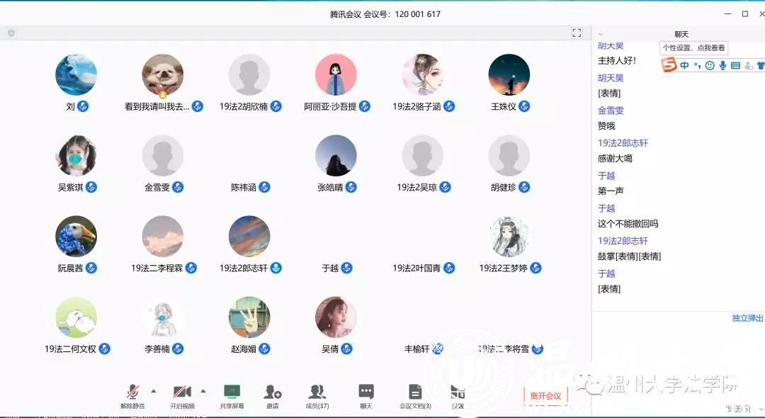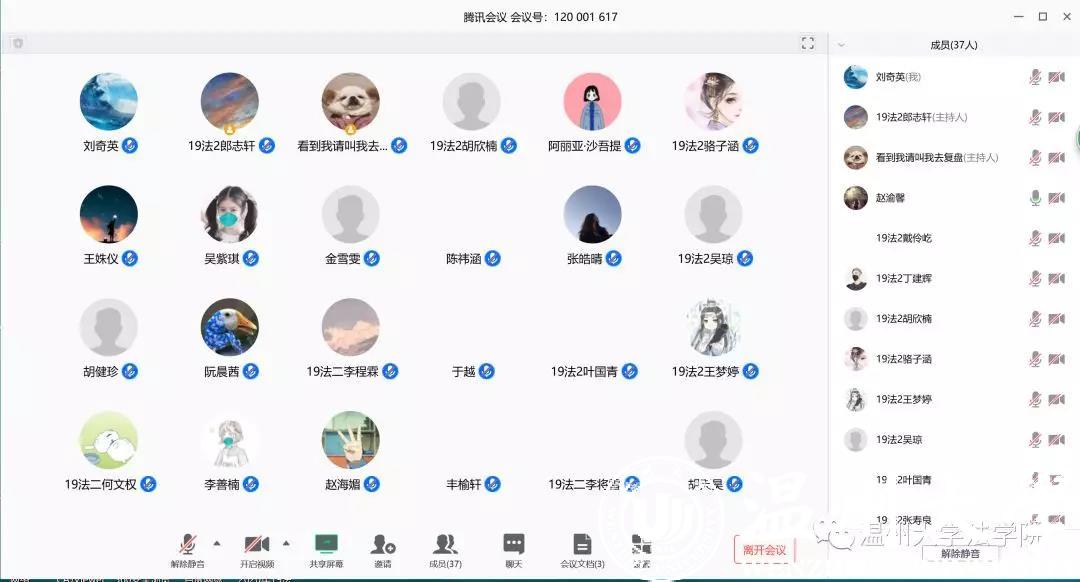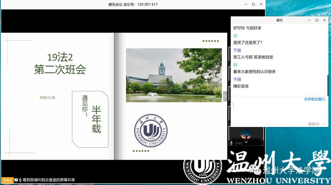 疫情就是命令,防控就是责任。根据省教育厅和学校有关工作部署,av天堂 辅导员、班主任主动深入学生,切实做好我院学生疫情防控有关工作。近日,av天堂 开展主题为“同心战'疫',温大学子在行动”的网络班会。其中,19法学2班开展线上主题班会,班主任刘奇英老师组织班级同学围绕疫情展开讨论、分享感悟,表达了对这场战疫终将胜利的信心和美好祝愿。