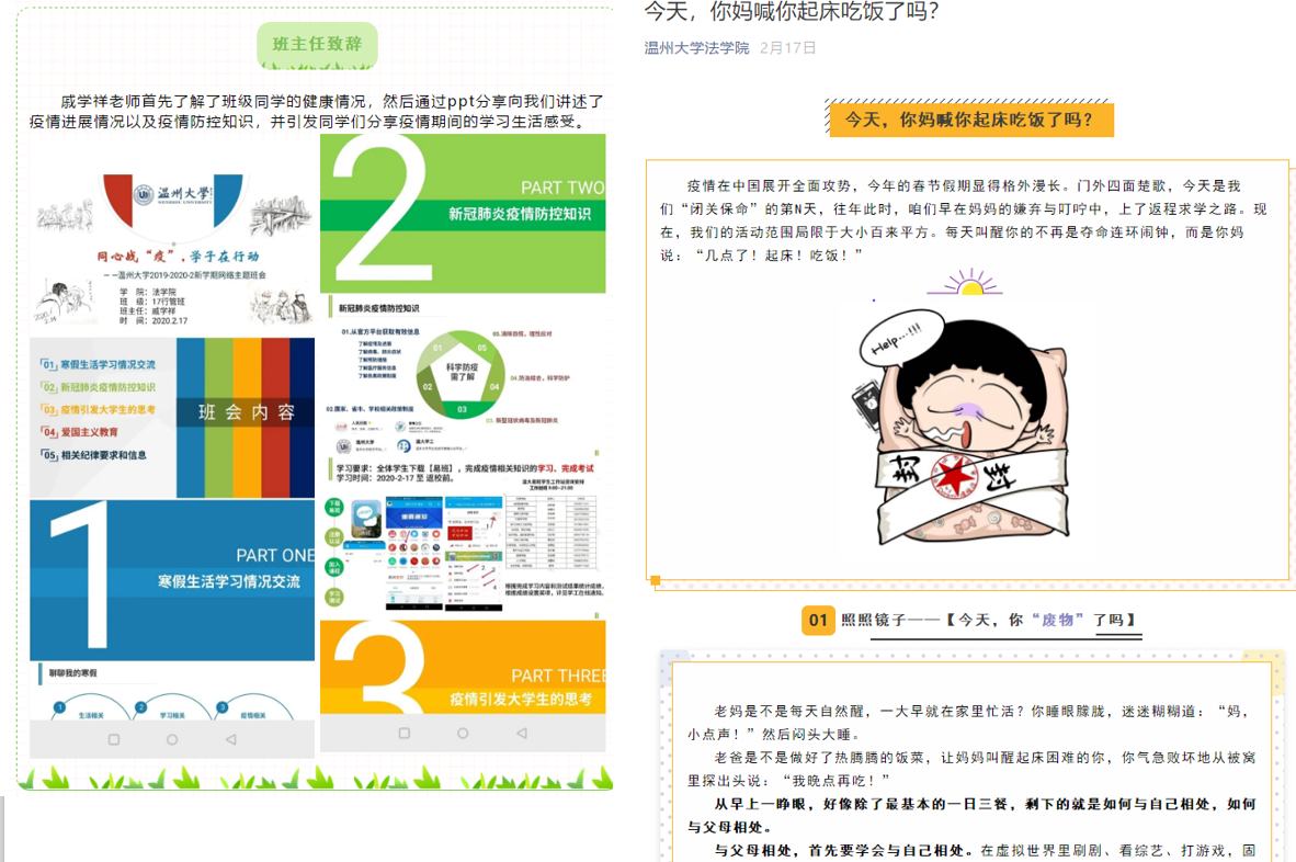“晒”朋辈分享,开展同心战“疫”主题班会,针对如何宅家学习深入讨论,分享学在家“金点子”。