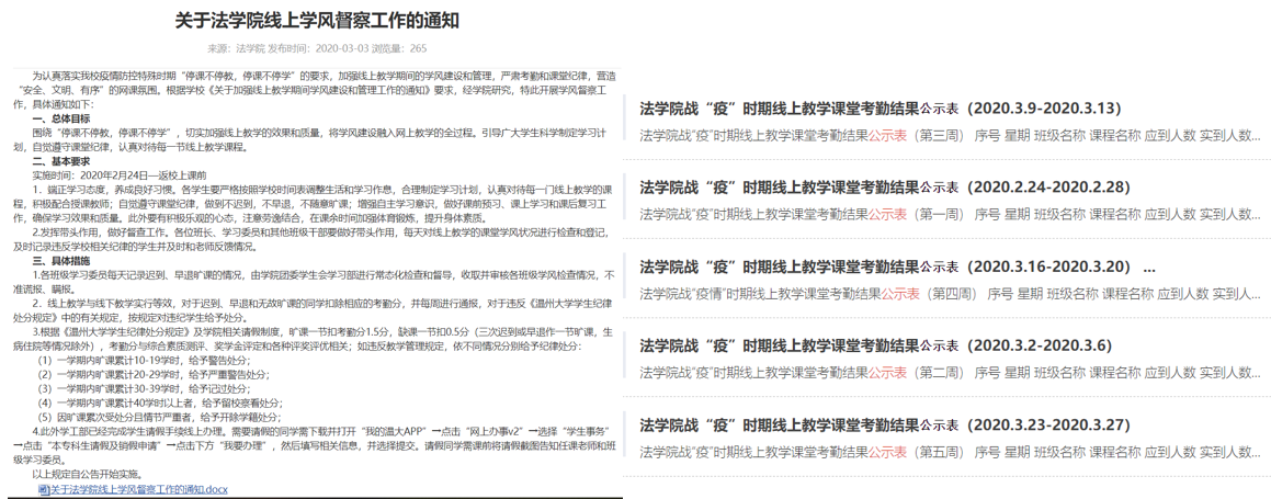 “晒”学风纪律,各班学生干部每日上报学习纪律情况,av天堂 每周公示各班线上学风纪律。