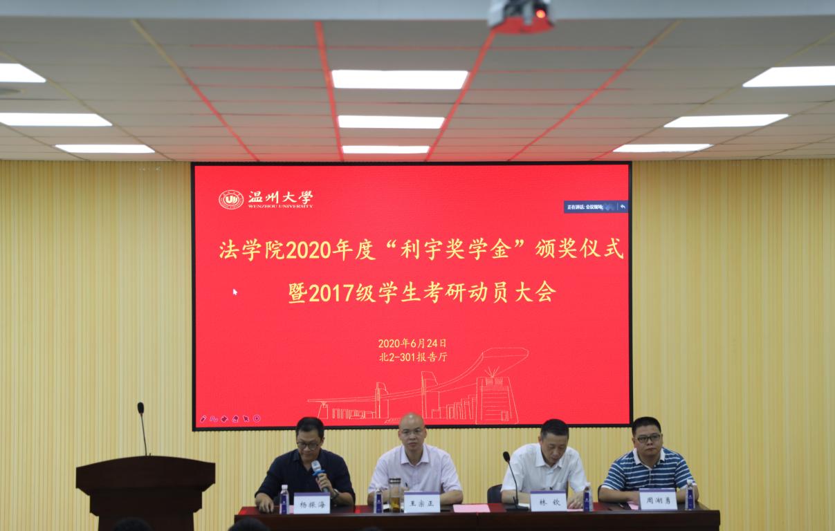 6月24日下午,av天堂 2020年度“利宇奖学金”颁奖仪式暨2017级学生考研动员大会在北2-301报告厅举行。本次会议采用线上线下同步进行。院长王宗正、党委书记林钦、副书记杨振海、副院长周湖勇、学工办辅导员、2020届考取研究生学生代表、2017级学生、2018级考研学生代表参加现场会议,其余学生通过视频直播方式参加线上会议。大会由党委副书记杨振海主持。